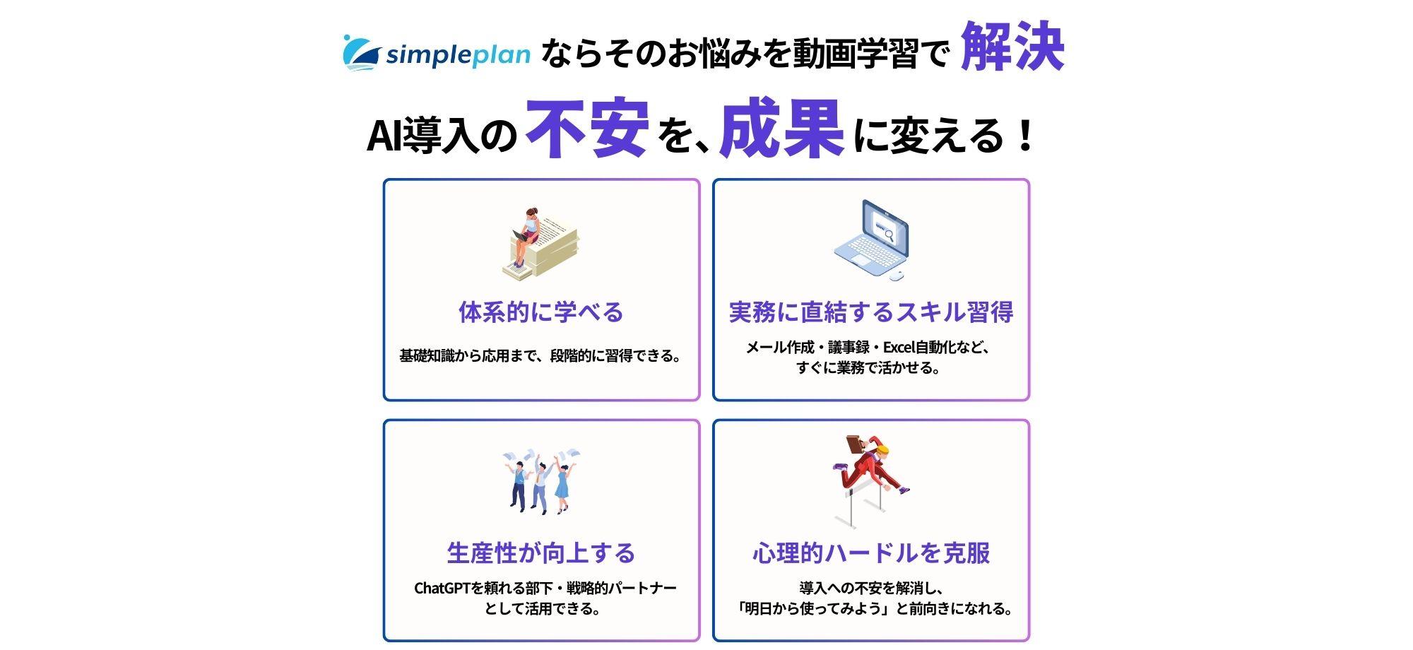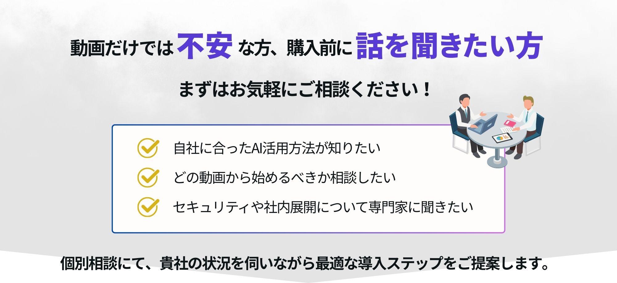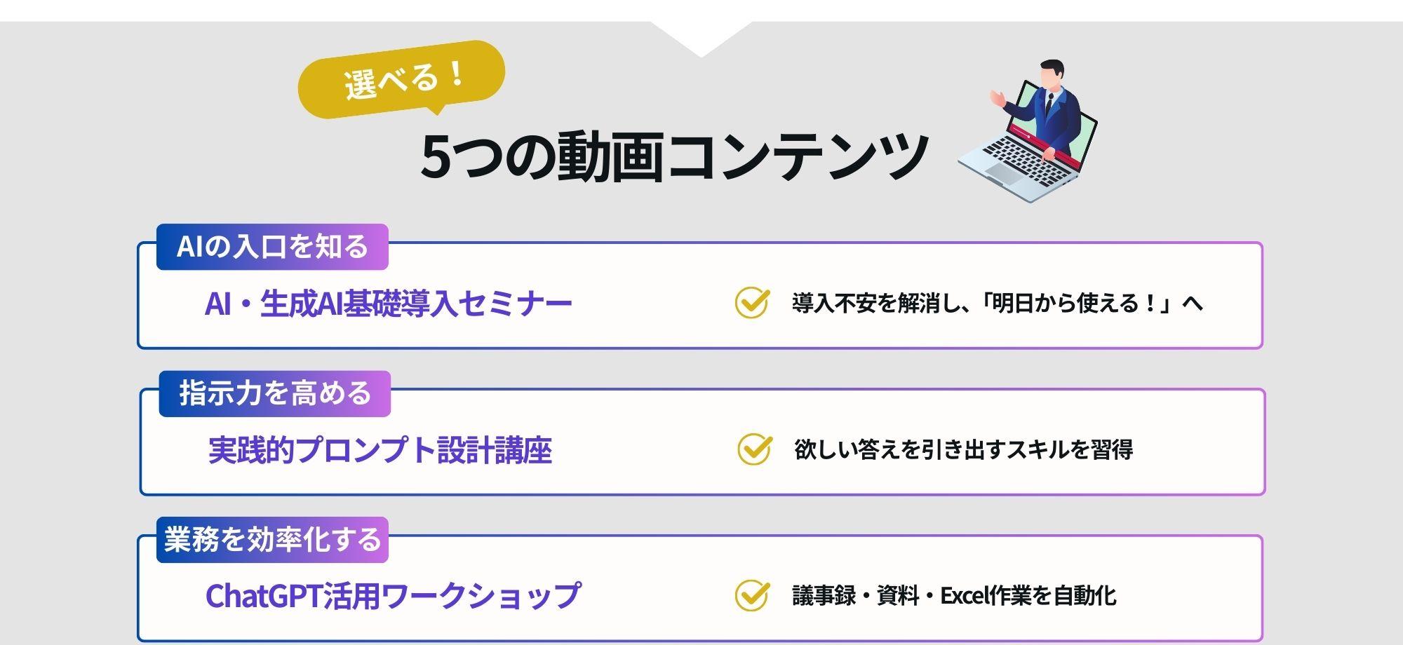 1本ずつ購入するよりも効率的に、体系的にAI活用を習得できます。 営業資料や議事録、Excel自動化など実務に直結するスキルも網羅。 これ1つで、AIを“頼れる部下・戦略的パートナー”に育てられます。