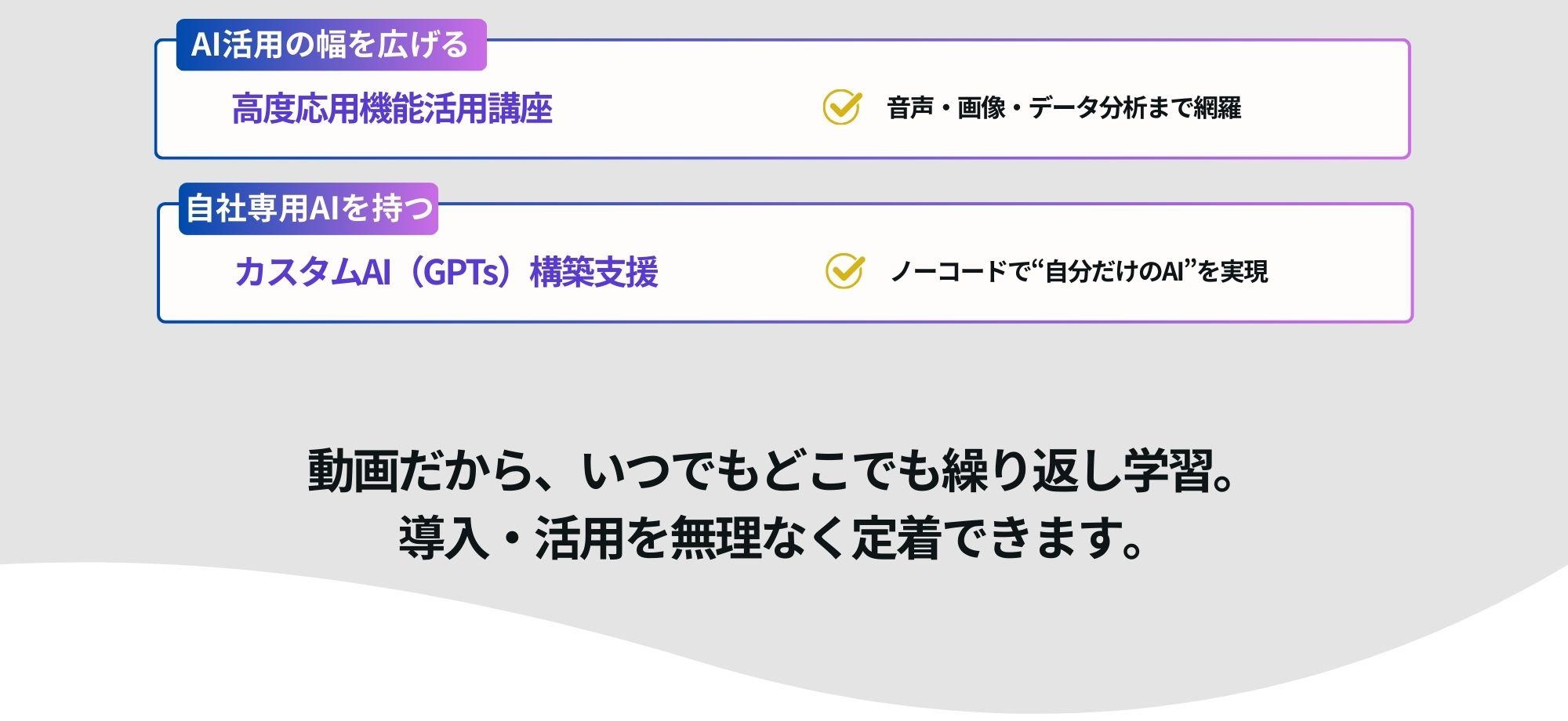 テキストだけでなく音声・画像・データ分析機能も習得。 英会話練習や営業ロープレ、プレゼン資料の画像生成まで体験可能。 Code Interpreterを用いたファイル操作や複雑なデータ分析にも挑戦します。